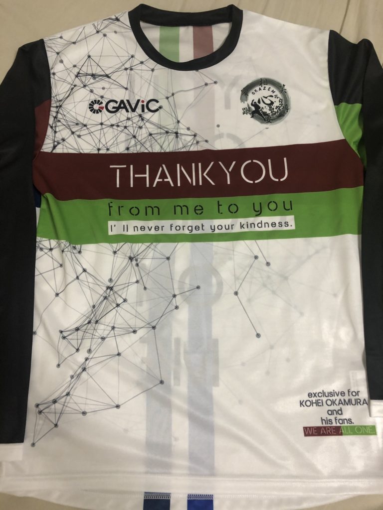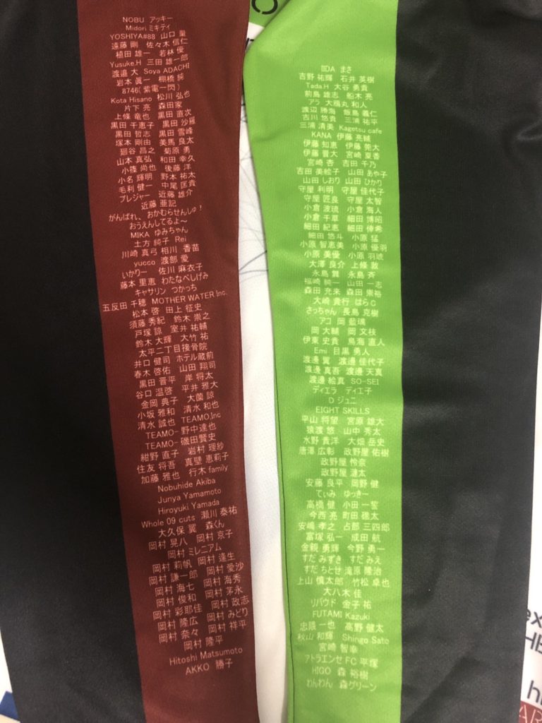 岡村選手が所属してきたベルマーレと現在所属しているフウガの色を基調に、袖部分にクラウドファンディングに参加してくれた人たちの名前を入れさせていただきました。