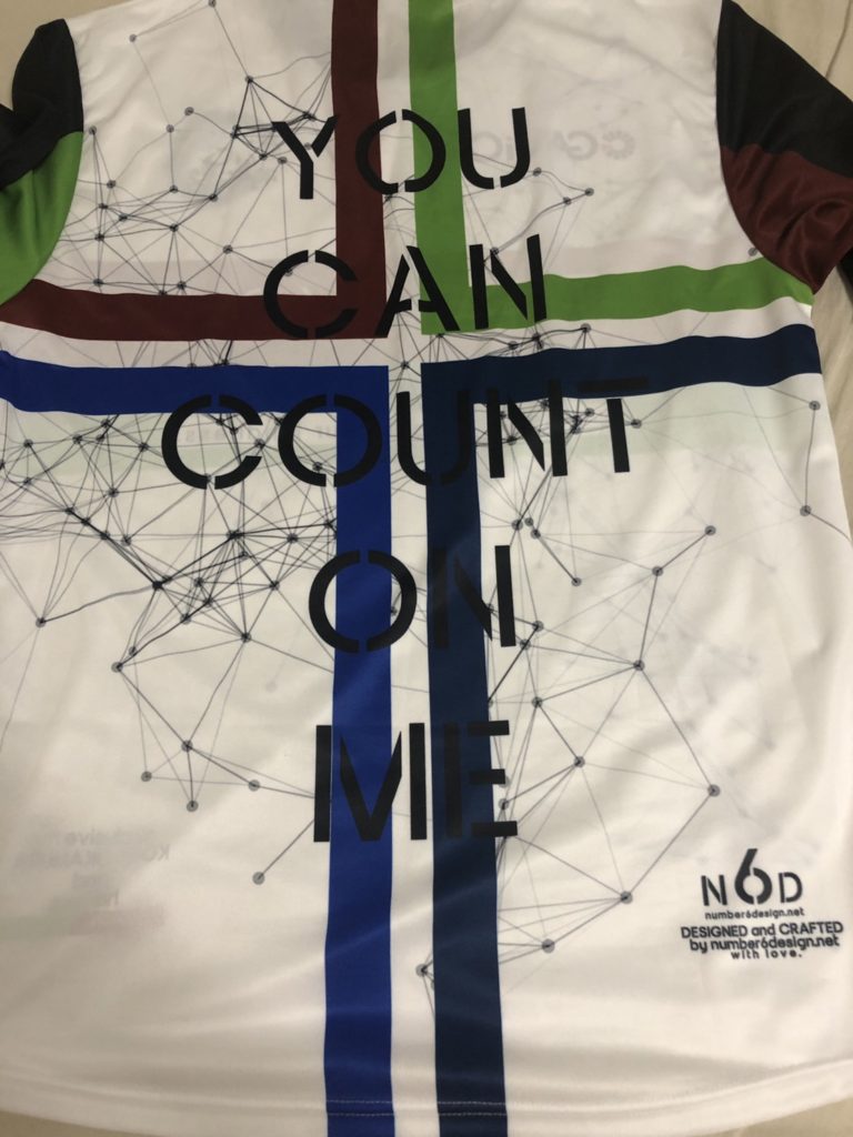 今回のシャツをデザインするに当たって、このフレーズがピッタリだと思ったんだよね。何年経っても、岡村選手は参加してくれた人に会うたび、あ、この人あの時助けてくれたんだよなあ、と思い出すだろうと。ここら辺が面白いところで、 一度恩を受けたら、それを返すまで繋がりは続く。返した後も感謝の念が永遠に残る。 一度恩を受ける、施す、ことがずっとずっと続く関係を作る。これつて最高だな、と考えたんだよね。で、 背負うには最高のフレーズだな、と。 意味的には、当てにしていいからねとか、仲間だからな、とか、なんかあったらすぐに駆けつけるからな、困ったら言えよ、という意味もある。だから、背中に you can count on me が入ってるなんて、一度受けた恩はわすれないぞ、と、今回のテーマにピッタリで最高にクールだな、と。